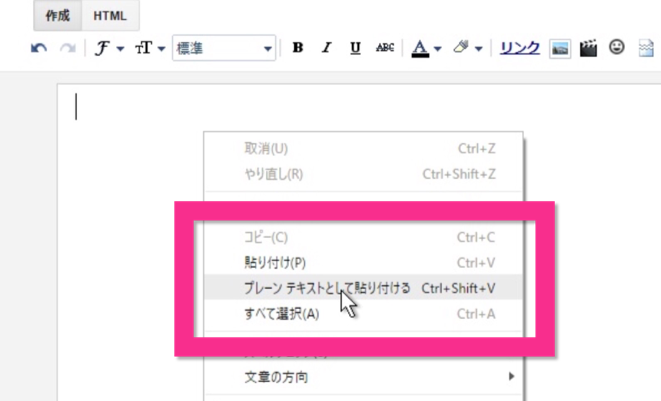 「プレーンテキストとして貼り付ける」